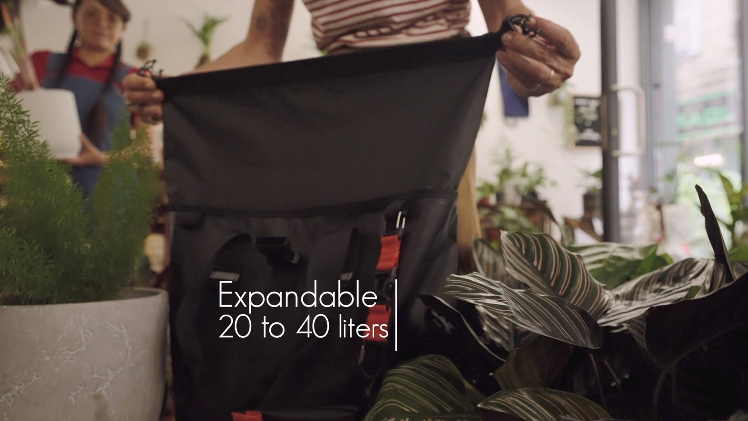 The roll top 210D dual coating lining remains hidden for your 20L compact urban commute. When more packing room is needed it extends to up to 40L in a blink